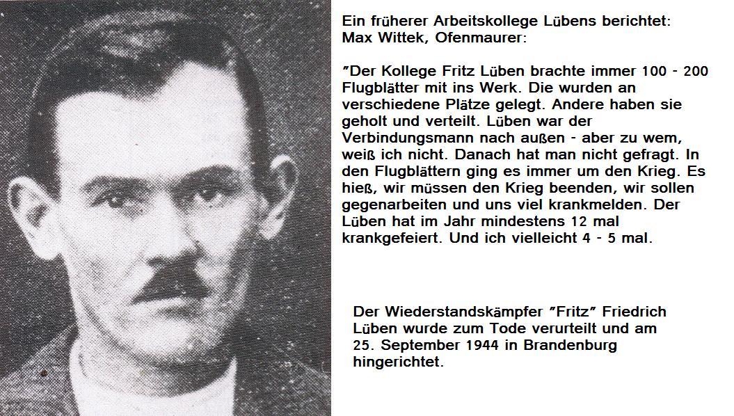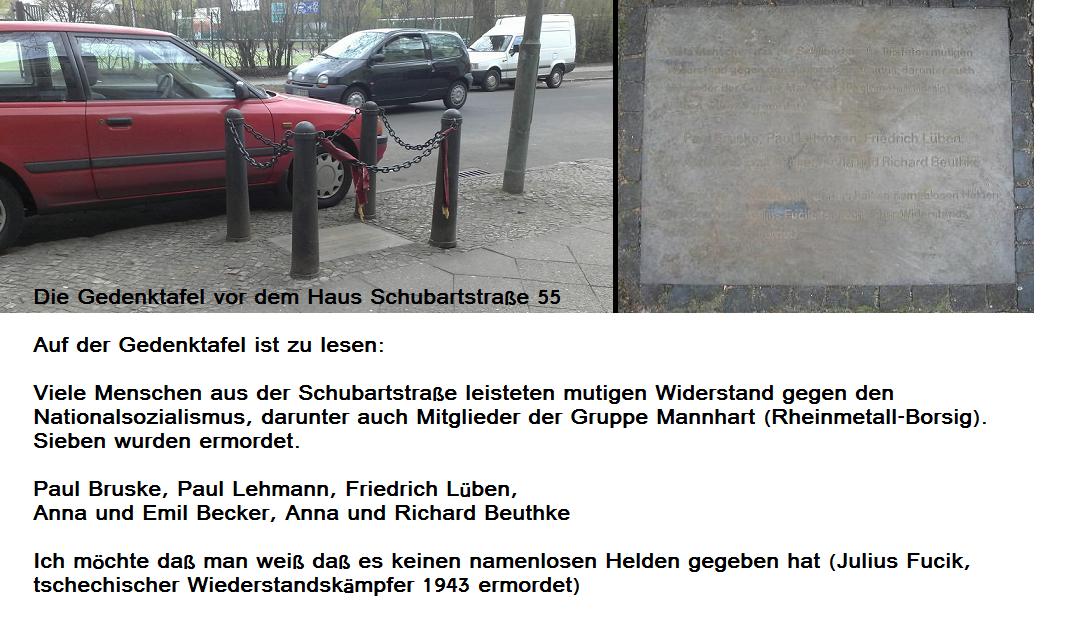 Dieses Haus wurde 1905 von Georg Mai erbaut. Währen des 2. Weltkrieges wohnte im Hinterhaus der Bauarbeiter Fritz (Friedrich) Lüben, der von 1941 - 1943 Mitglied der Wiederstandsgruppe "Mannhart" war, deren 20 - 25 Mitglieder hauptsächlich im Werk Rheinmetall-Borsig in Tegel arbeiten. Die Mitglieder der Wiederstandsgruppe wohnten zumeist in Borsigwalde und trafen sich regelmäßig in der Wohnung von Fritz Lüben in der dortigen Schubartstraße 55, wo sich die ersten Jahre nach dem 2. Weltkrieg bereits eine Gedenktafel befand, die aber im Zuge einer Hausrenovierung entfernt wurde. Die Gruppe war überparteilich; verschiedene Konfessionen und parteipolitisch Übezeugungen vereinigten sich im Kampf gegen die nationalsozialistische Gewaltherrschaft. Gemeinsam hörten die Mitglieder ausländische Sender ab, was damals bei Todesstrafe verboten war. Gemeinsam verfassten sie Flugblätter in deutscher, französischer ud russischer Sprache, vervielfältigen und verteilten sie. In den Flugblättern versuchten sie die Sinnlosigkeit des Krieges darzustellen. Sie veröffentlichten darin die Zahlen der auf allen Seiten gefallenen Soldaten und der Verwundeten, die Höhe der Kriegskosten, Art und Zahl von Kriegsverbrechen. Darüber hinaus führten sie Sabotageaktionen bei Borsig durch, das damals Rüstungsbetrieb war. Das reichte vom Krankfeiern bis zur Blokieren von Maschienen, zur Herstellung minderwertiger Zementmischungen und zum Bau zu schwacher Betonfundamente für die Aufstellung von Maschinen. Bei all diesen Aktionen, insbesondere auch für das Verteilen von Flugblättern und die Weitergabe von Parolen, wirkte sich günstig aus, das ein großer Teil der Wiederstandskämpfer einen Mobilen Bautrupp bei Borsig bildete und so praktisch zu allen Werkshallen Zutritt hatte. Im Herbst 1943 wurden zwölf Mitglider der "Mannhart"-Gruppe verhaftet. Das war das Ende des Wiederstandes bei Borsig. Die Verhafteten wurden in die Untersuchungsgefängnisse am Alexandreplatz und in Moabit gebracht und zum Teil unter Anwendung von Foltermethoden verhört. Es fanden insgesamt drei Verhandlungen vor dem Volksgerichtshof statt, eine davon unter Vorsitz seines berüchtigten Präsidenten Roland Freisler. Betriebsratmitglieder von Borsig haben damals in den Verhandlungen ihre Kollegen mutig verteidigt. Vier der Angeklagten, die die Führungsspitze der Wiederstandsgruppe gebildet hatten, darunter Fritz Lüben, wurden zum Tode verurteilt und am 25. September 1944 in Brandenburg hingerichtet. Sechs wurden zu Zuchthausstrafen verurteilt und im April 1945 von den Russen aus dem Zuchthaus Brandenburg befreit. Zwei wurden freigesprochen. Fritz Lüben Foto