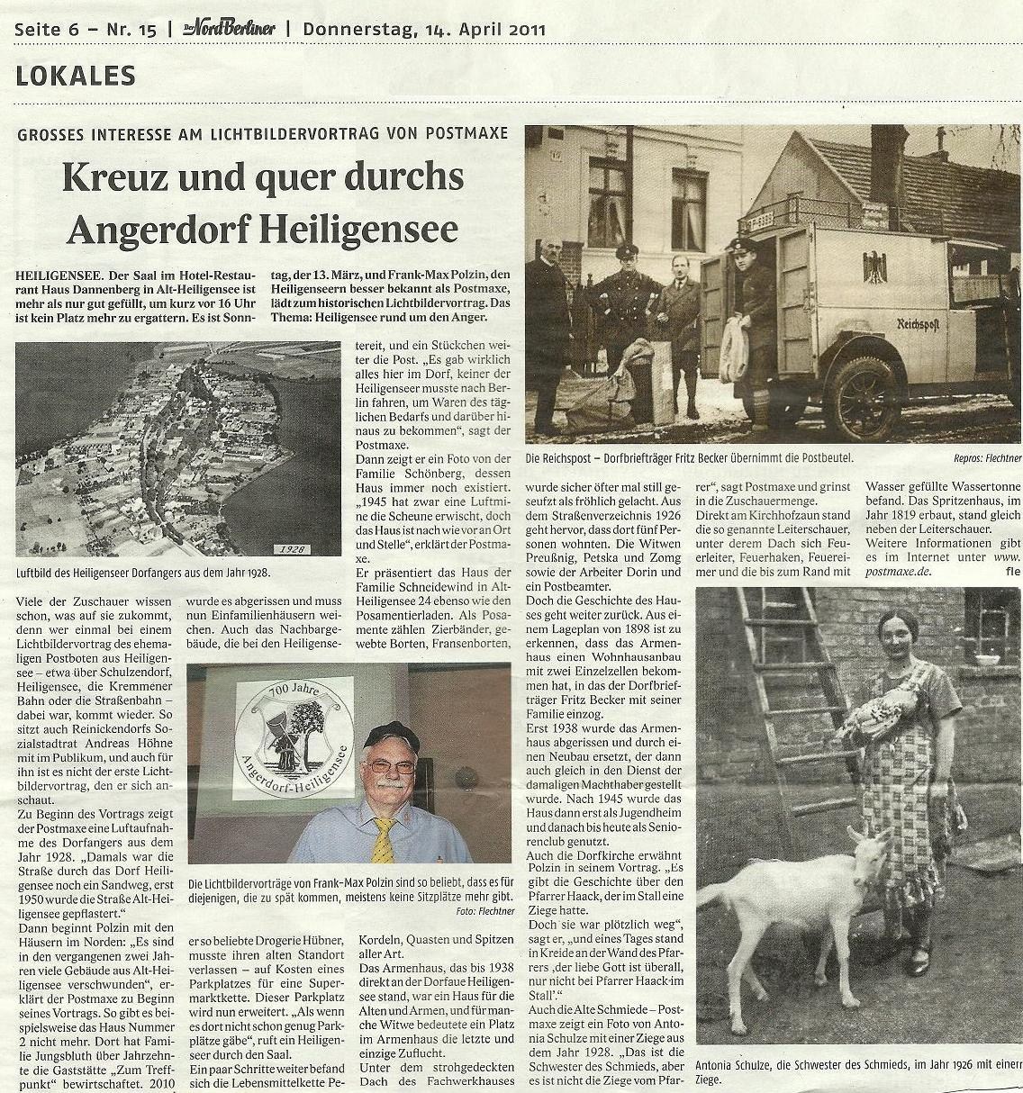Im April 2011 berichtet "DerNordBerliner" über Postmaxe seinen Lichtbildervortrag "Angerdorf Heiligensee